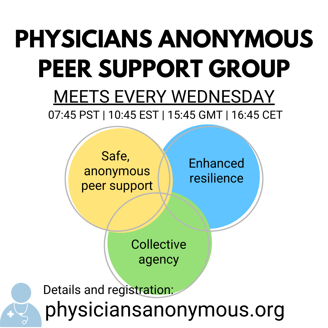 Physicians Anonymous is a doctor-only completely confidential and anonymous online platform offering facilitated peer-support groups, coaching, and courses. We offer a safe space for doctors to share our triumph and despair, laughter and tears, and through this become more resilient to the enormous challenges a career in medicine brings. You can choose be remain anonymous or identify yourself on the call.